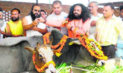 Members of the Hopes & Harmony Raksha Gau Lok Dham Ashram rescued 95 cows from a slaughter house here on Monday night. The cows have been kept at Anand Van and will be taken care of by ashram members.
